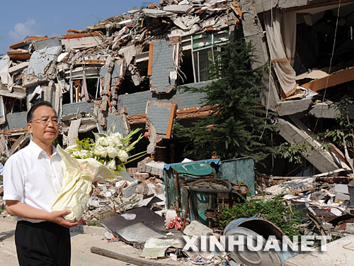 9月1日,溫家寶徒步一個小時,進入地震中慘遭滅頂之災(zāi)的北川縣城,在遇難者集體掩埋處向遇難者獻花。新華社記者 黃敬文攝