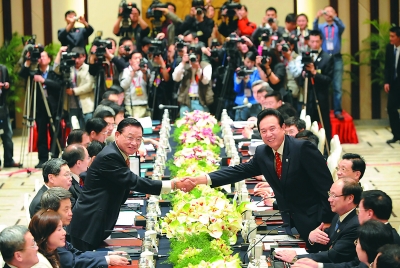 2009年4月26日上午,海峽兩岸關(guān)系協(xié)會會長陳云林(右)與海峽交流基金會董事長江丙坤在南京舉行會談。這是兩會恢復(fù)協(xié)商后領(lǐng)導(dǎo)人第三次會談。新華社記者 孫 參攝