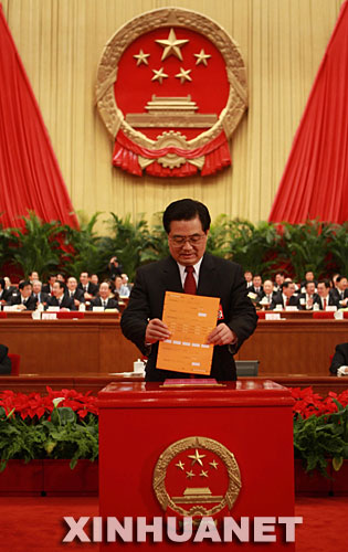 3月15日,十一屆全國人大一次會議在北京人民大會堂舉行第五次全體會議,選舉第十一屆全國人民代表大會常務委員會委員長、副委員長、秘書長;選舉第十一屆全國人民代表大會常務委員會委員;選舉中華人民共和國主席、副主席;選舉中華人民共和國中央軍事委員會主席。這是胡錦濤在投票。 新華社記者鞠鵬攝 (組圖)