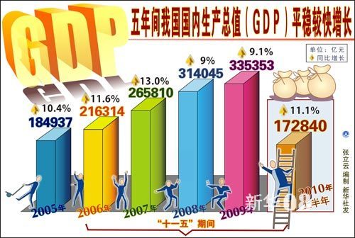 新華社圖表,北京,2010年10月11日?qǐng)D表:五年間我國(guó)國(guó)內(nèi)生產(chǎn)總值(GDP)平穩(wěn)較快增長(zhǎng)新華社發(fā)