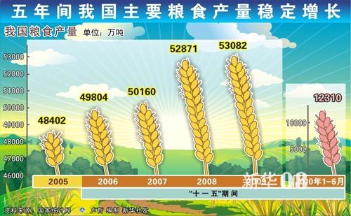 新華社圖表,北京,2010年10月11日?qǐng)D表:五年間我國(guó)主要糧食產(chǎn)量穩(wěn)定增長(zhǎng) 新華社發(fā)