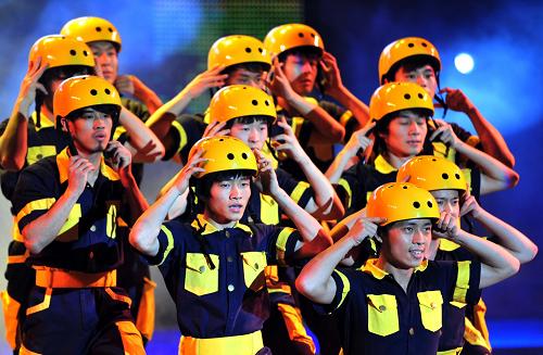 4月22日,來(lái)自深圳市寶安區(qū)總工會(huì)的演員在文藝晚會(huì)上表演《快樂的建筑工》。