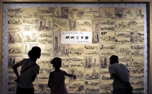 8月26日,幾位觀眾在觀看馮明創作的鵬城百景圖。新華社記者 陳曄華 攝