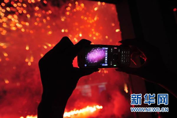 9月6日晚,一位市民用手機拍攝深圳上空綻放的絢麗煙花。新華社記者 陳曄華攝