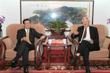 圖1:全國政協(xié)副主席、中國和平統(tǒng)一促進(jìn)會副會長羅豪才(右)親切會見訪問團(tuán)成員。