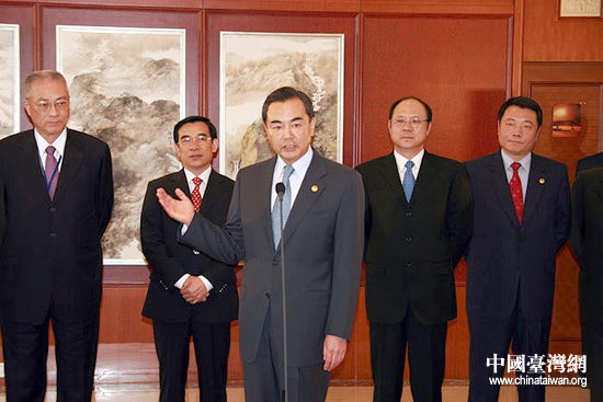 5月25日上午,中共中央臺辦主任王毅在首都機場致辭歡迎中國國民黨主席吳伯雄一行。中國國民黨主席吳伯雄率領中國國民黨大陸訪問團于25日11時許乘機抵達北京,開始訪問大陸行程。中共中央臺辦主任王毅到機場迎接。(中國臺灣網 鐘寶華 攝)
