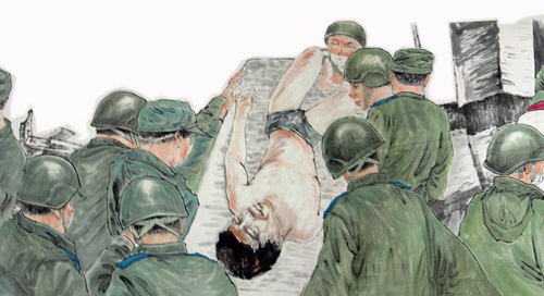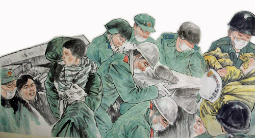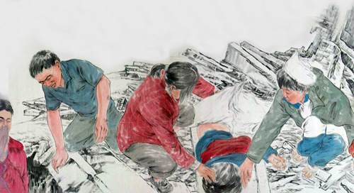 這幅被命名為《振起豐碑》的國畫人物長卷,高1米多,長100多米,裱好后的重量達30多公斤,畫卷中的人物多達600多名,有領導人親臨一線指揮救災的情景,有解放軍官兵奮力救災的情景,有醫務人員冒險救死扶傷的場面,還有從廢墟中被救出的人們,感嘆劫后余生的場景。