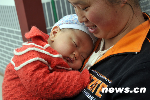 5月6日,2個(gè)月大的楊遠(yuǎn)志在媽媽懷中酣睡。當(dāng)天,“地震周年網(wǎng)絡(luò)媒體災(zāi)區(qū)行”采訪活動(dòng)來(lái)到四川省都江堰市向峨鄉(xiāng)棋盤村永久性住房安置點(diǎn)。楊遠(yuǎn)志是災(zāi)后出生的小寶寶,目前他和家人所住的新家水、電、氣、光纖等生活設(shè)施一應(yīng)俱全。新華網(wǎng) 前衛(wèi) 攝