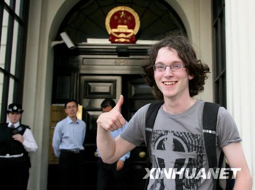 7月27日,在倫敦,英國(guó)青年艾薩克·劉易斯走向中國(guó)駐英大使館。當(dāng)天,劉易斯結(jié)束了為中國(guó)四川地震災(zāi)區(qū)進(jìn)行的240英里(約386公里)的徒步募捐活動(dòng),抵達(dá)中國(guó)駐英大使館。他6月7日從北威爾士的家鄉(xiāng)出發(fā),目標(biāo)是募集3000英鎊(約合6000美元)善款,目前已募集到2500英鎊。 新華社記者謝秀棟攝