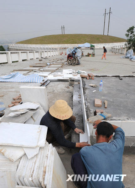 5月3日,工人正在加緊修建漢旺鎮5·12汶川大地震遇難者陵墓。新華社記者陳燮攝 |