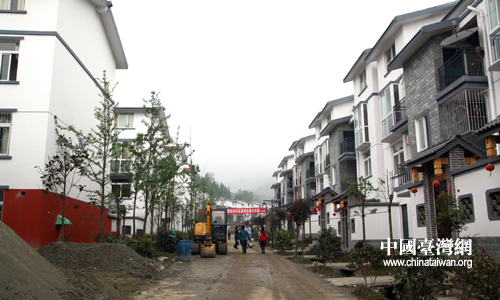 走進(jìn)都江堰市向峨鄉(xiāng)棋盤村董家新院子安置點(diǎn),寬闊的道路兩旁是聯(lián)排或獨(dú)棟的三層西式建筑,有些已經(jīng)竣工并有村民入住,有些則還在修建當(dāng)中。(中國(guó)臺(tái)灣網(wǎng) 田云鵬 攝)
