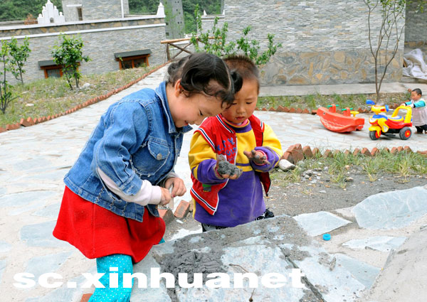 小朋友在羌寨新居前玩耍(4月26日攝)。 新華社記者 何俊昌 攝 |