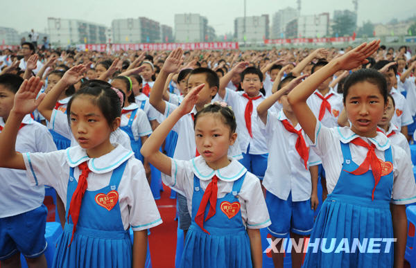 當(dāng)日,都江堰市災(zāi)后重建竣工投入使用的48所中小學(xué)校交接儀式暨2009年秋季開(kāi)學(xué)典禮在都江堰市北街小學(xué)新校區(qū)舉行。全市7萬(wàn)余名中小學(xué)生全部告別了板房學(xué)校,搬進(jìn)了災(zāi)后重建的永久性校園學(xué)習(xí)。 新華社記者 江宏景 攝