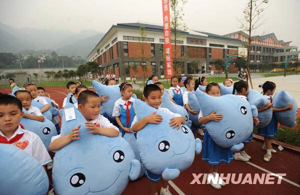 9月1日,在都江堰市北街小學(xué)新校區(qū),小學(xué)生們手抱校方制作的代表感激的“水滴娃娃”。 新華社記者 江宏景 攝