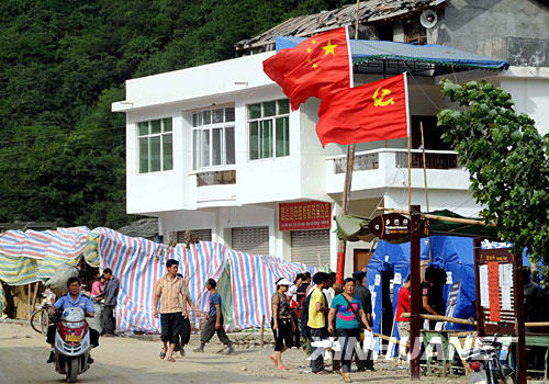 在四川青川縣板橋鄉(xiāng),救災部隊幫助鄉(xiāng)里搭建了帳篷學校,學校周圍插滿了五星紅旗(6月2日攝)。