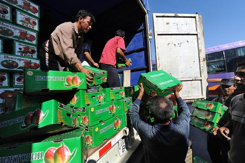 7月20日,工人在霍爾果斯競天國際客服中心為來自哈薩克斯坦的卡車裝車。進入夏季,新疆霍爾果斯口岸果蔬出口繼續保持較好的增長勢頭,每天往來口岸采購、運送果蔬的客商和物流車輛絡繹不絕。廣西的菠蘿、海南島的香蕉、山東的辣椒、陜西的蘋果以及新疆伊犁河谷出產的時鮮蔬菜經霍爾果斯口岸源源不斷地進入中西亞各國。據了解,2008年以來通過該口岸銷售到中亞國家的蔬菜、果品接近20萬噸,其中90%以上來自內地。霍爾果斯口岸已成為我國西部重要的果蔬出口重要通道。 新華社記者 李紫恒 攝