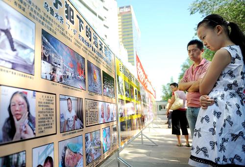 7月21日,市民在烏魯木齊市圖書館前觀看圖片展。當日,由烏魯木齊市委宣傳部、文化局主辦的新疆維吾爾自治區烏魯木齊市打砸搶燒嚴重暴力犯罪事件紀實圖片展在烏魯木齊市圖書館前展出,300余幅圖片真實地再現了烏魯木齊“7·5”事件發生、處置、善后全過程。從22日起,該圖片展還將進入部隊、社區、學校、鄉鎮等地巡展。新華社記者王菲 攝
