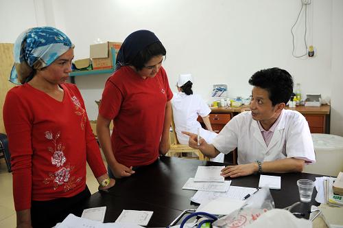 7月22日,韶關市曲江區中醫院醫生杜鳴(右)在韶關旭日玩具廠醫務室為新疆籍員工看病。新華社記者 劉大偉 攝
