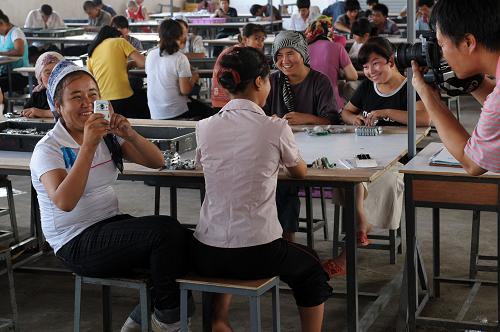 7月22日,在韶關旭日玩具廠務工的一名新疆籍員工(前左)拿起手機與正在采訪的記者對拍起來。目前在韶關旭日玩具廠工作的新疆籍員工有755人,7月以來,員工總數一直保持穩定。韶關市委副書記林耀明表示:“我們不會讓一次偶然發生的治安事件影響到韶關和新疆的經貿合作和務工交流。未來我們將進一步采取措施,妥善安置新疆籍員工在韶關的務工、生活,讓他們在韶關長期安心就業。”新疆勞務輸出先進縣——喀什地區疏附縣負責人也表示:“經過廣東和新疆兩方面的共同努力,在韶關安心地長期就業,已是這里700多名新疆少數民族外出務工人員的共同心聲”。由于近日廣東天氣炎熱、氣候潮濕,有個別新疆籍員工感到不適應而離開韶關返回家鄉。旭日玩具廠負責人說,盡管采取了一系列防暑降溫措施,但由于兩地氣候環境差異大,還是有一些新疆籍員工感冒、中暑。“他們回新疆避暑,我們是理解的。歡迎他們在暑期過后繼續回來工作。”這位負責人說。 新華社記者 劉大偉 攝