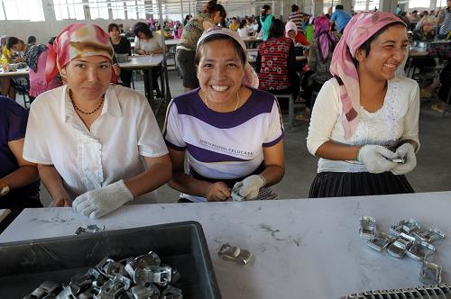 7月22日,在韶關旭日玩具廠務工的新疆籍員工努爾古麗·麥麥提玉蘇甫(左)和熱孜凡尼古麗·麥麥提玉蘇甫(中)姐妹倆在生產線上工作。新華社記者 劉大偉 攝