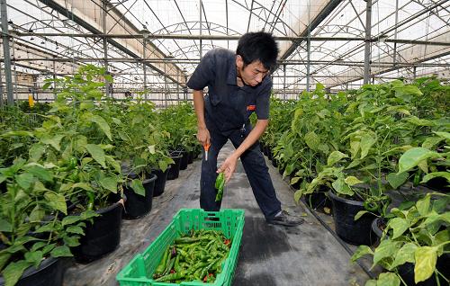 克拉瑪依曾林科技生態園的職工在采摘“螺絲椒”(7月29日攝)。戈壁油城新疆克拉瑪依引進滴灌種植等技術和先進設備,積極發展綠色種植業,生產出的彩椒、黃瓜和金瓜等綠色蔬菜受到顧客歡迎。新華社記者 趙戈 攝