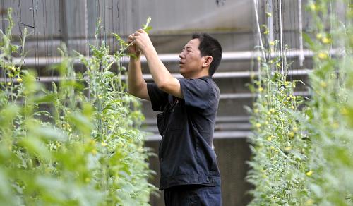 克拉瑪依曾林科技生態園的職工在察看無土栽培黃瓜的長勢(7月29日攝)。 新華社記者 趙戈 攝