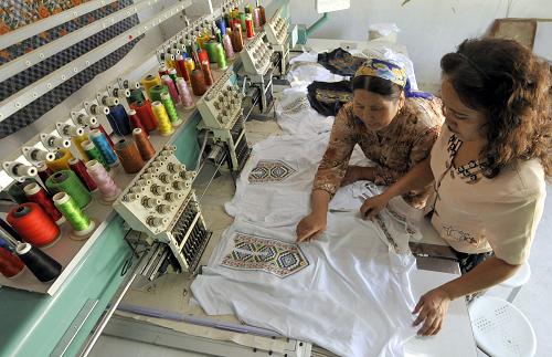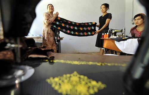 阿加汗·賽買提展示她的民族刺繡作品(7月31日攝)。現年57歲的阿加汗·賽買提是有“中國民間文化藝術之鄉”之稱的新疆哈密市回城鄉維吾爾族農民,她是當地有名的農民畫家和剪紙藝術家,更是名揚鄉里的民族手工藝刺繡能手。她的民族手工藝刺繡作品受到眾多維吾爾族群眾喜愛,年輕人結婚會整套訂制。看到商機的阿加汗·賽買提將自己的手藝傳給3個女兒,購置了專業設備,開辦起家庭式的民族刺繡加工廠。如今,她加工的民族繡品不僅銷往新疆各地,還有日本客商前來訂貨,一年能給這個家庭帶來4萬多元的收入。新華社記者 沈橋 攝