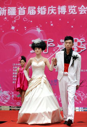 8月6日,模特在婚慶博覽會上展示婚禮服裝。當日,新疆首屆婚慶博覽會在烏魯木齊市新疆國際博覽中心開幕。婚慶博覽會分為婚紗、攝影精品、結婚首飾精品、婚慶服務、喜宴用品、新婚家居精品、家用汽車等8個展區。 新華社發(江文耀 攝)