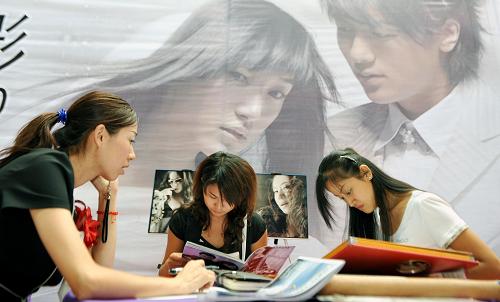 8月6日,一名參展人員(左)在婚慶博覽會上向顧客介紹婚紗攝影。 新華社發(江文耀 攝)