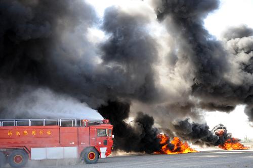 8月6日,一輛消防車在演習現(xiàn)場滅火。當日,新疆喀什地區(qū)應急辦和喀什機場等單位聯(lián)合舉辦機場處突應急救援綜合演習。演習旨在檢驗公安、武警和衛(wèi)生等部門在突發(fā)狀況下的協(xié)同配合能力。 新華社記者 周文杰 攝