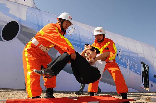 8月6日,一名“傷員”被救援人員抬下飛機。 新華社記者 周文杰 攝