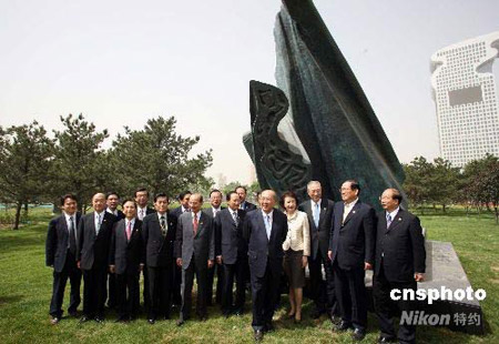 5月28日,中國國民黨主席吳伯雄一行前往北京奧林匹克中心區,參觀臺灣藝術家楊英風的雕塑作品“水袖”。中新社發 盛佳鵬 攝