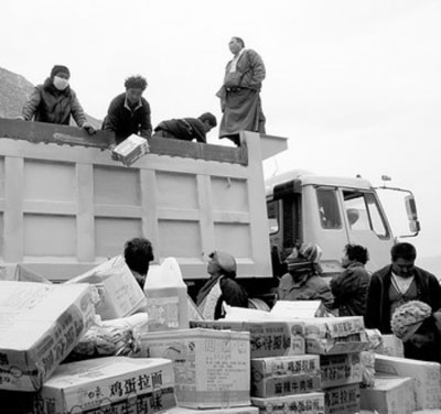 4月18日,由青海省天峻縣群眾捐助的物資,發放到災區群眾手中。(記者 李琛奇 攝)