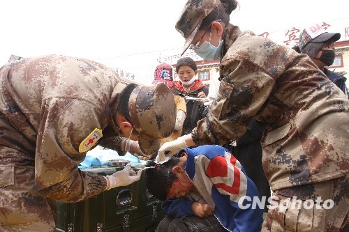 4月17日,青海省玉樹藏族自治州玉樹縣地震發生第四天,地震災區各個救援點及時醫治受災民眾。 中新社發 郭國權 攝