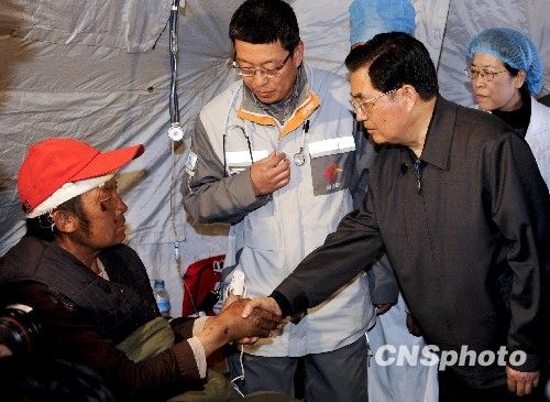 4月18日中午12點(diǎn)10分許,中共中央總書記、國家主席、中央軍委主席胡錦濤先來到青海玉樹地震重災(zāi)區(qū)結(jié)古鎮(zhèn)扎西大同村視察災(zāi)情,慰問災(zāi)區(qū)受災(zāi)民眾以及參加抗震救援的解放軍指戰(zhàn)員、武警、公安等。