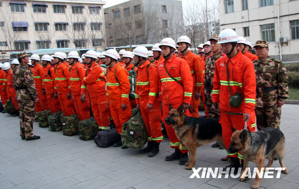 當(dāng)日,寧夏消防總隊迅速組織120名精干力量乘7輛機動車,攜帶2只搜救犬、6種500件(套)個人防護器材、4種20件套偵檢器材、12種50件套破拆器材、8種40件套救生照明器材及通信、醫(yī)療器材和飲食物資等,前往青海省玉樹縣抗震救災(zāi)。新華社發(fā)(高軍 攝)