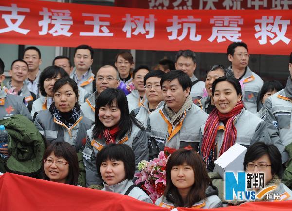 4月15日,醫療隊員臨行前在北京南苑機場合影。當日,北京第一批急救醫療隊趕赴青海玉樹地震災區開展救援。急救醫療隊由來自北京大學第一醫院、北京大學第三醫院、北京大學人民醫院、北京積水潭醫院、北京朝陽醫院、北京兒童醫院和北京急救中心的60余名醫護人員組成,包括臨床骨科、普外、腦外、腎內、胸外等專業,同時攜帶近8噸的急救物資和生活用品。新華社記者李文攝