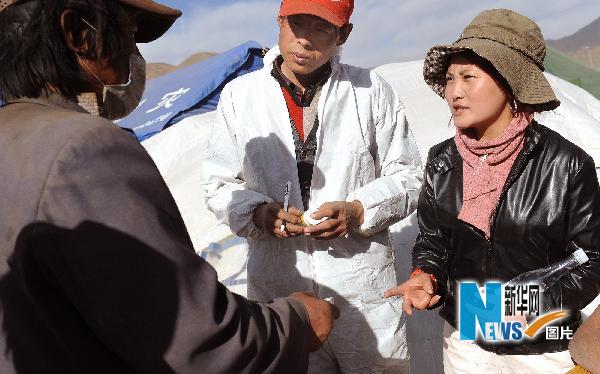 4月26日,家在結古鎮的西北師大學生朋措(右一)正向看病的藏族群眾翻譯醫生的用藥標準。