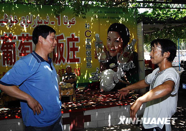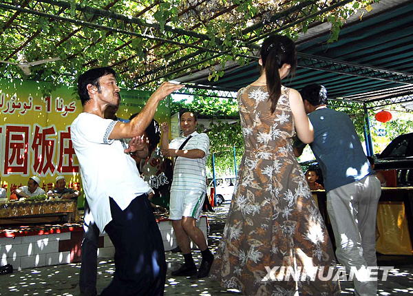7月22日,新疆吐魯番葡萄溝的維吾爾族村民為來自西安的游客表演舞蹈。新華社記者戴旭明攝