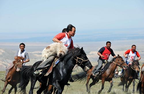 8月16日,選手們在激烈的叼羊比賽中。8月16日,一場由哈薩克和蒙古族牧民參加的叼羊比賽在新疆烏蘇市天山腳下的賽力克提牧場舉行。叼羊是哈薩克族傳統的體育項目,為了增進各民族的團結和友誼,豐富農牧民群眾的精神文化活動,當地每年都舉辦蒙古族的那達慕大會、哈薩克族的叼羊比賽和姑娘追等少數民族傳統體育活動。新華社發(江文耀 攝)