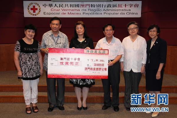 8月13日,澳門執業西醫公會向澳門紅十字會捐贈2萬澳門元,援助甘肅舟曲受災群眾。截至當日,澳門紅十字會共收到澳門社會各界向舟曲災區的捐款373.06萬澳門元。 新華社發 (張金加攝)