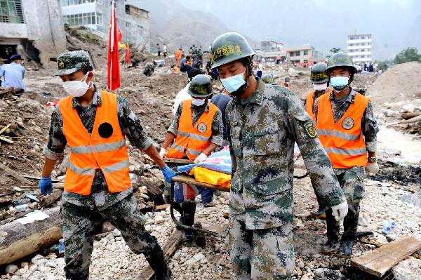 8月13日,救援人員將搜尋到的遇難者遺體抬離現(xiàn)場。根據(jù)最新統(tǒng)計數(shù)字,截至13日16時,甘肅省甘南藏族自治州舟曲縣特大山洪泥石流災(zāi)害已造成1156人死亡、588人失蹤。 新華社記者 陶明攝