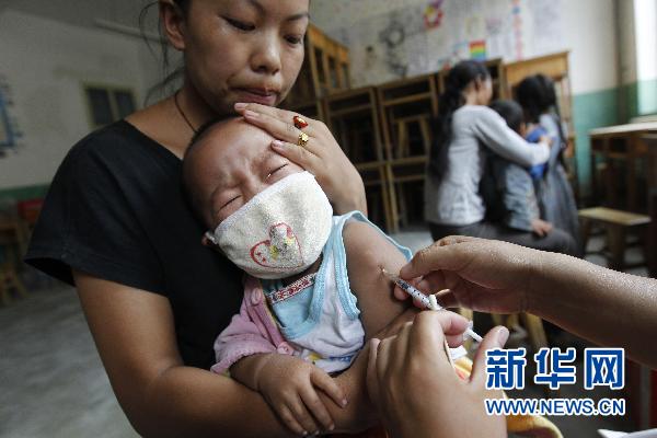 8月18日,在甘肅舟曲縣城獨(dú)立中學(xué)受災(zāi)群眾安置點(diǎn),醫(yī)務(wù)人員在為幼兒接種甲肝疫苗。鑒于舟曲災(zāi)區(qū)目前的衛(wèi)生和疾病預(yù)防形勢(shì),甘肅省、甘南藏族自治州、舟曲縣三級(jí)疾控中心自8月16日開始,為災(zāi)區(qū)1歲半至6歲的幼兒大面積接種甲肝疫苗,防止甲肝疾病的發(fā)生。截至8月18日12時(shí),已有約500名幼兒接種了甲肝疫苗。新華社記者 任正來 攝