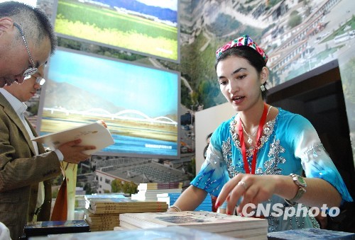 9月9日下午,維吾爾族姑娘凱迪日耶?阿卜來(lái)提(右)為參觀《內(nèi)蒙古、新疆、廣西、寧夏、西藏自治區(qū)成就展》的觀眾發(fā)放圖書(shū)資料。凱迪日耶是本次展覽新疆廳的講解員。 中新社發(fā) 侯宇 攝