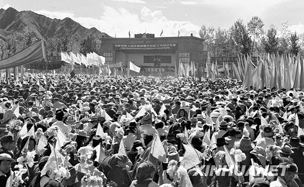 1965年9月,拉薩各界各族人民3萬多人舉行集會游行,熱烈慶祝西藏自治區成立(資料照片)。