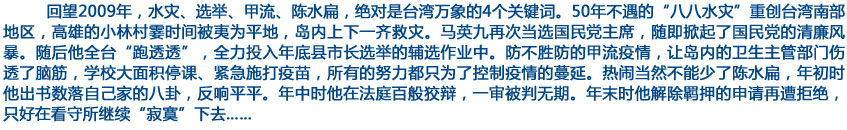 | 臺風(fēng)“莫拉克”挾風(fēng)帶雨掠過臺灣,最終釀成重大災(zāi)害。“88水災(zāi)”再次讓劉兆玄“內(nèi)閣”改組的討論浮上臺面。6成6的民眾認(rèn)……【全文】 |