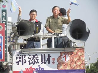 郭添財(cái)陣營昨天上午起謝票,郭添財(cái)臨時(shí)缺席,由國民黨大臺(tái)南市黨部主委蘇明國(右)、競選總部總協(xié)調(diào)王方生(左)接手上路。