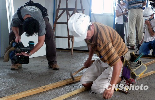 8月23日,大陸3名技術(shù)人員現(xiàn)身臺(tái)灣高雄縣災(zāi)民安置活動(dòng)板房建設(shè)工地。深圳雅致集成房屋公司工程部經(jīng)理?xiàng)钤平邮茉L問(wèn)時(shí)表示,他們一行將為活動(dòng)板房搭建工作提供技術(shù)支持,并對(duì)現(xiàn)場(chǎng)施工人員進(jìn)行培訓(xùn);另外,公司有7個(gè)技術(shù)人員待命、可隨時(shí)前來(lái)協(xié)助。中新社發(fā) 劉舒凌 攝
