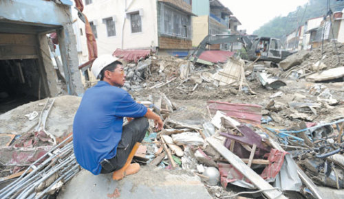 高雄縣那瑪夏鄉(xiāng)民族村在“莫拉克”風(fēng)災(zāi)中受創(chuàng)嚴(yán)重,一名村民看著被洪水與泥石流沖壞的房子,滿目凄涼。圖片來源:臺灣《聯(lián)合報》