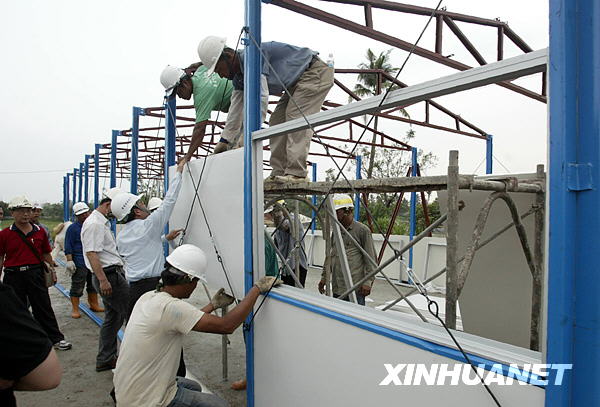 8月20日,大陸援助臺灣臺風(fēng)“莫拉克”災(zāi)區(qū)的首批活動板房已運抵受災(zāi)嚴(yán)重的屏東縣佳冬鄉(xiāng),當(dāng)?shù)毓ぷ魅藛T已開始試裝工作。新華社發(fā)